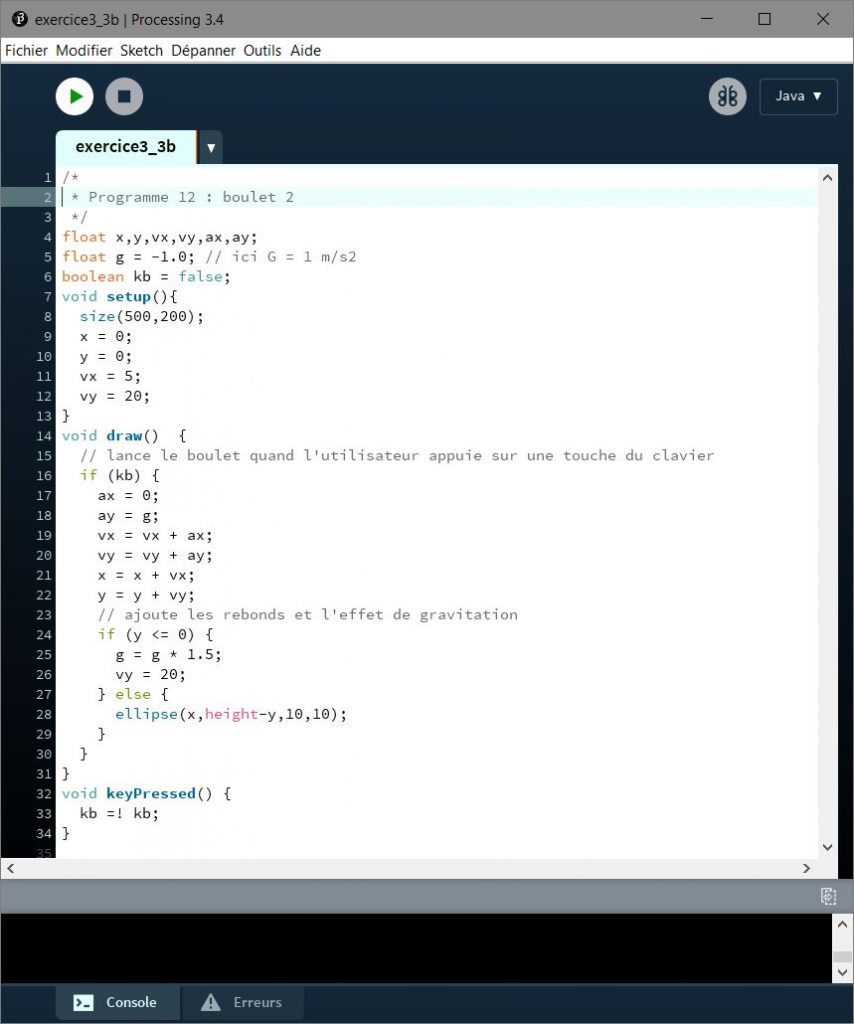 - Lorsque le boulet touche le sol il rebondit et perd de la vitesse (effet traduit par une augmentation de la gravité).