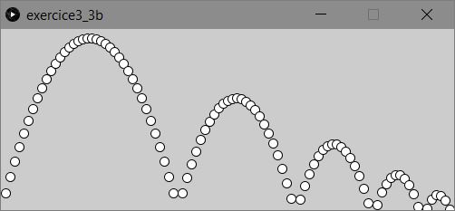 /* * Programme 11 : boulet 2 */ float x,y,vx,vy,ax,ay; float g = -1.0; // ici G = 1 m/s2 boolean kb = false; void setup(){ size(500,200); x = 0; y = 0; vx = 5; vy = 20; } void draw() { // lance le boulet quand l'utilisateur appuie sur une touche du clavier if (kb) { ax = 0; ay = g; vx = vx + ax; vy = vy + ay; x = x + vx; y = y + vy; // ajoute les rebonds et l'effet de gravitation if (y <= 0) { g = g * 1.5; vy = 20; } else { ellipse(x,height-y,10,10); } } } void keyPressed() { kb =! kb; }