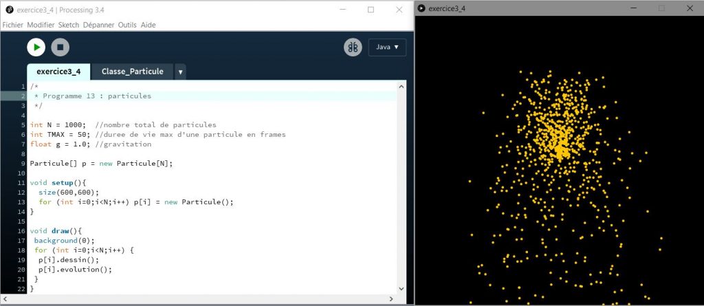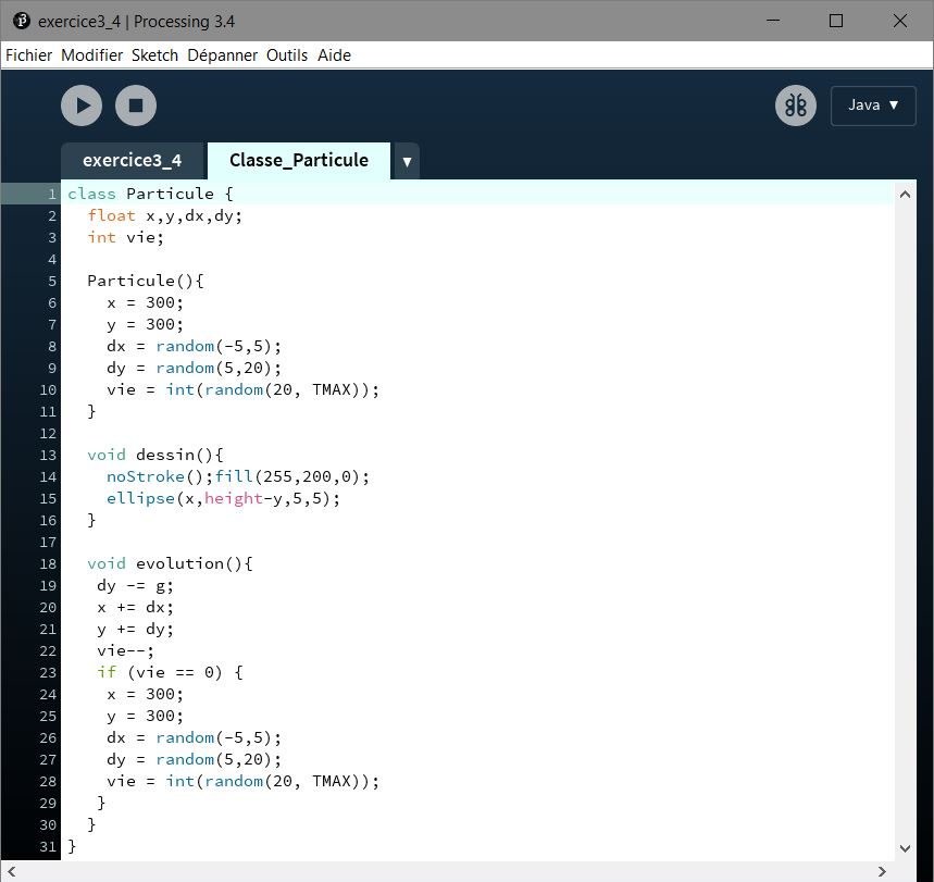 class Particule { float x,y,dx,dy; int vie; Particule(){ x = 300; y = 300; dx = random(-5,5); dy = random(5,20); vie = int(random(20, TMAX)); } void dessin(){ noStroke(); fill(255,200,0); ellipse(x,height-y,5,5); } void evolution(){ dy -= g; x += dx; y += dy; vie--; if (vie == 0) { x = 300; y = 300; dx = random(-5,5); dy = random(5,20); vie = int(random(20, TMAX)); } } }