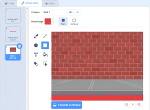 Dessiner ensuite une barre rouge en bas de la scène en allant dans l’onglet « Arrière-plan » en haut de la palette de blocs.