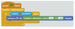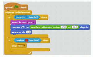 Cliquer sur le drapeau vert et tester le résultat. La balle continue son chemin et efface toutes les briques qu’elle croise. Il faudrait plutôt qu’elle « rebondisse » dans une direction aléatoire, pour imiter le choc contre la brique. Ajouter les blocs suivants au script de la balle (utiliser la pipette comme précédemment pour prendre la couleur des briques) :
