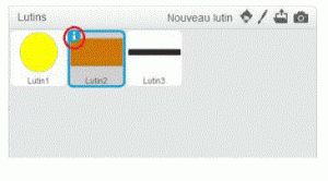 Renommer les lutins soit directement dans l’interface de dessin, en haut à gauche, soit en cliquant sur le petit « i » bleu en haut à gauche de l’icône du lutin sélectionné.