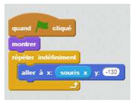 A présent, il faut pouvoir diriger la raquette grâce à la position de la souris. Sélectionner le lutin « raquette » et ajouter les blocs ci-dessous dans son aire de script.