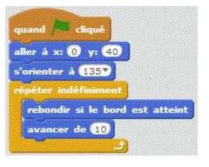 La balle doit faire plusieurs choses. Commencer par la faire bouger et rebondir sur les bords, en ajoutant les blocs suivants à son script :