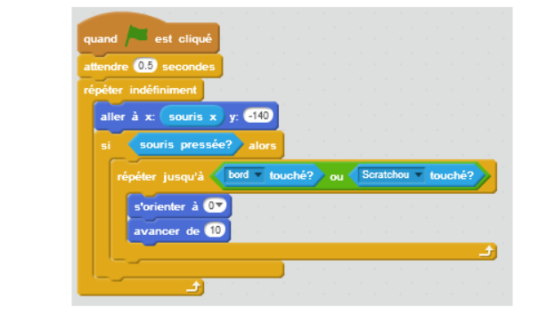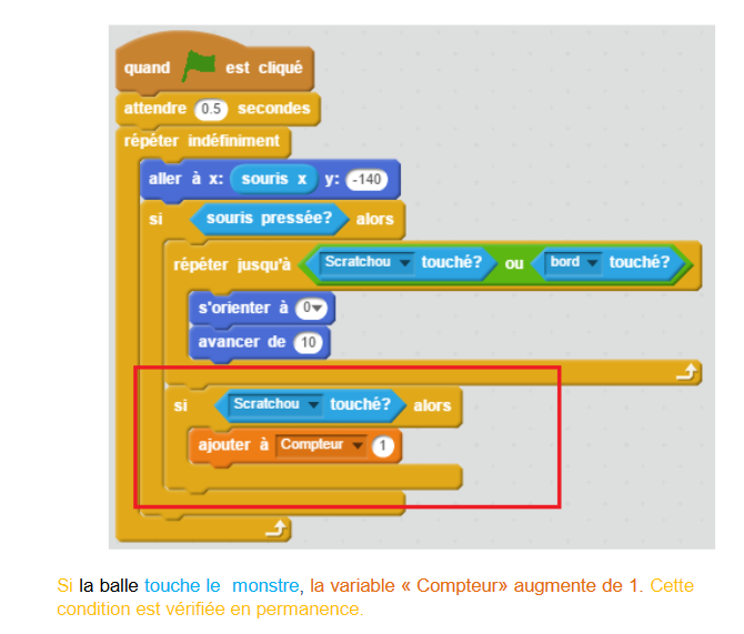 Lorsque le drapeau est cliqué, l’ordinateur va attendre 0,5 secondes (démarrage du jeu). Puis, sans s’arrêter (« indéfiniment »), l’ordinateur va faire bouger la balle en suivant horizontalement la souris (« aller à x = souris x »). Si le joueur clique, alors la balle avance vers le haut de la scène à une vitesse de 5, et ce jusqu’à ce que le bord ou le monstre soit touché.