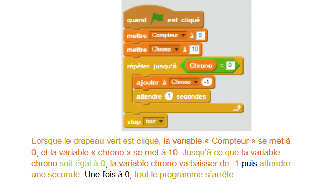Cliquer le drapeau vert et tester le résultat. La partie devrait durer dix secondes, puis s’arrêter.