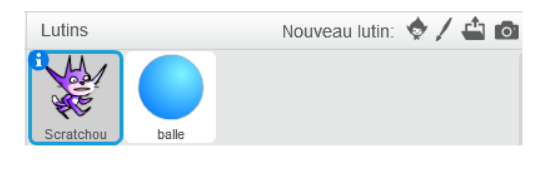 Cliquer sur le petit «i» bleu en haut à gauche de l’icône de chacun des lutins pour les renommer, par exemple « balle » et « Scratchou » :