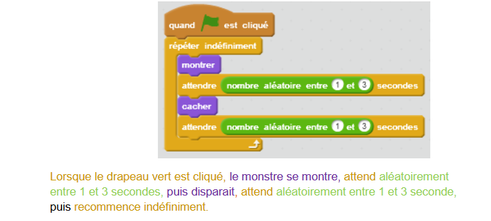 Pour rendre le monstre plus dynamique, ajouter les blocs suivants pour qu’il disparaisse et apparaisse en permanence :