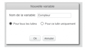 Aller dans l’onglet « données », cliquer « nouvelle variable », la nommer « compteur ». Cocher la case « pour tous les lutins ».