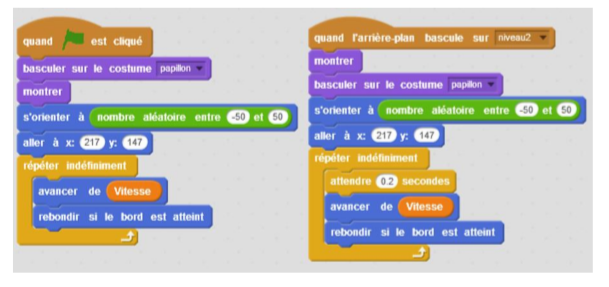 1. Quand le drapeau vert est cliqué, le papillon affiche son costume « papillon », il apparait et s’oriente aléatoirement entre -50° et 50° puis va en haut à droite de la scène (X = 217 et Y = 147). Enfin, indéfiniment, il va avancer à une vitesse définie par la variable « Vitesse », et repartir de l’autre côté si jamais il atteint un bord.