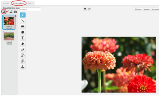1. Tout d’abord, il va falloir choisir deux décors qui seront utilisés pour les deux niveaux de votre jeu. Aller dans « scène » et importer deux arrière-plans (par exemple, dans « nature »). Les renommer « niveau1 » et « niveau2 ».