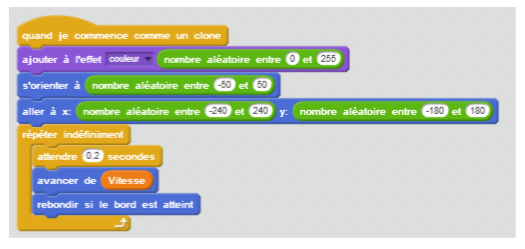 3. Pour pouvoir interagir avec le clone, il faut utiliser un bloc « Quand je commence comme un clone ». Dans notre exemple, cela se traduit par le code suivant :