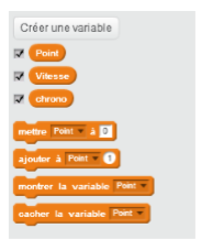 1. Aller dans l’onglet « Script » du papillon puis « données » et « créer une variable » appelée « point » qui s’appliquera à tous les lutins. Il doit y avoir en tout trois variables.