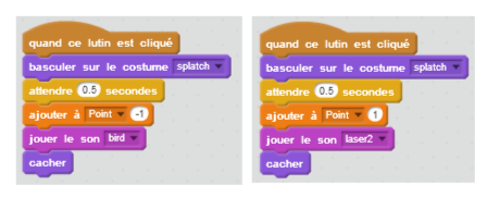 2. Maintenant, il faut faire en sorte que lorsque l’on clique sur un papillon, on perde un point et sur une abeille, on gagne un point. Écrire ce bloc dans le script des deux lutins. On peut y ajouter un son pour rendre le jeu plus animé. Nous avons choisi le son « laser2 » dans « électronique » pour l’abeille et le son « bird » dans « animal » pour le papillon. Dès que l’on cliquera sur l’un des lutins, le son sera joué. Il faut aussi basculer sur le deuxième costume. Pour finir, il faut cacher les lutins quand on clique eux.