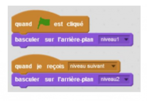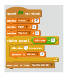Quand le drapeau vert est cliqué, les variables adoptent les valeurs définies. Puis la valeur « chrono » perdra 1 toutes les secondes jusqu’à ce qu’elle soit égale à 0. Dès lors, le message « niveau suivant » est envoyé, ce qui va permettre au programme de modifier le cours des actions