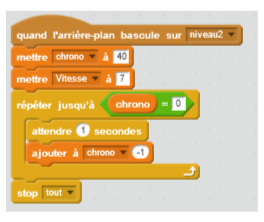 Nous avons choisi dans notre exemple une vitesse de 5 pour le niveau 1 et une vitesse de 7 pour le niveau 2. Cela permettra de corser un peu plus le jeu et de rajouter une difficulté au niveau suivant. Nous avons aussi mis un décompte au chronomètre, celui-ci s’arrêtera quand le temps sera écoulé..