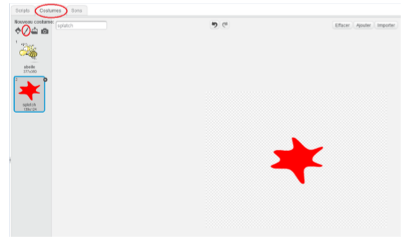 2. Il faut ensuite créer un deuxième costume pour chaque lutin. Nous allons nous même le dessiner en cliquant sur l’icône de pinceau. Tracer une forme de « Splatch » symbolisant l’écrasement du pauvre insecte.