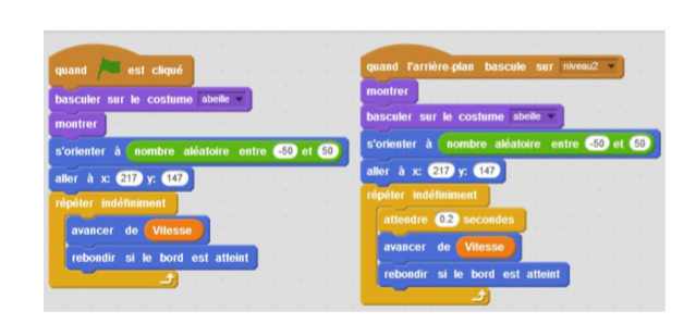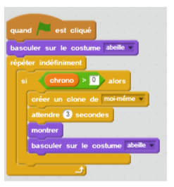 3. Dupliquer ces deux blocs dans le script de l’abeille. Pour l’abeille, modifier légèrement le script, pour que le costume bascule sur le costume « abeille ».