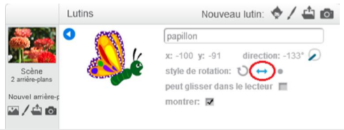 4. Les lutins peuvent se déplacer dans toutes les directions et ils se retrouvent parfois avec la tête à l’envers. Pour éviter cela, cliquer sur « retournement gauche-droite uniquement » dans la fenêtre ouverte en cliquant sur le « i » bleu en bas à gauche à coté du lutin. Cliquer sur la double flèche comme l’image :