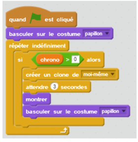 1. Pour rendre le jeu plus amusant, nous allons créer des clones. Pour démarrer, écrire le bloc suivant dans le script du papillon :
