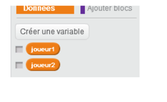 Aller dans «Données» et créer deux variables appelées «joueur1» et « joueur2». Décocher les cases pour ne pas qu’elles s’affichent sur la scène. Ces variables vont nous permettre de compter les points.