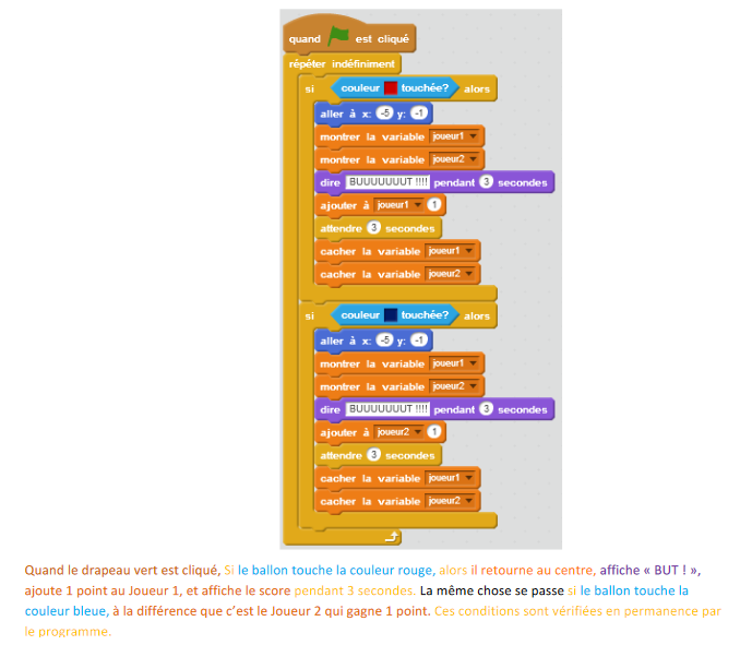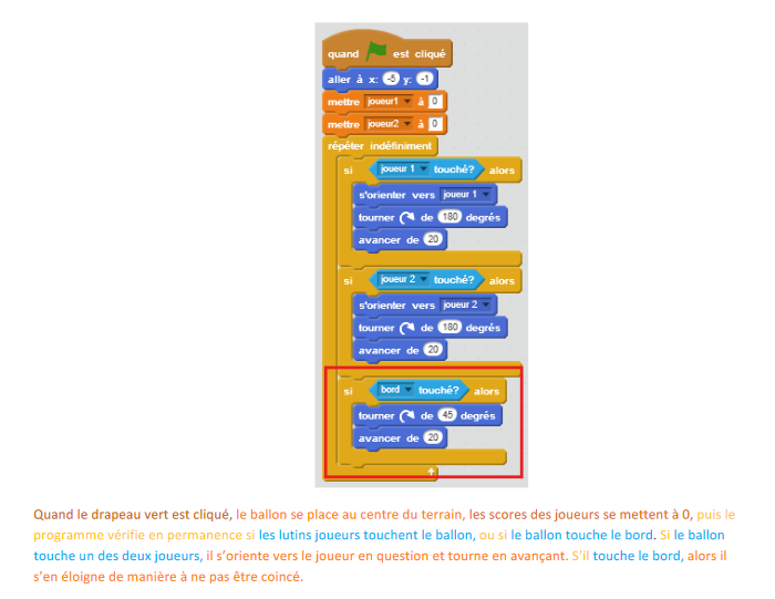 Attention à la section encadrée rouge, qui sert à gérer les contacts avec le bord du terrain. Scratch propose le bloc « rebondir si le bord est atteint », mais il ne faut pas l’utiliser ici car la balle pourrait devenir coincée entre le bord et un joueur.