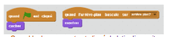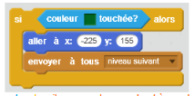 Ajouter les blocs ci-dessous à la fin du programme pour détecter quand le lutin a touché la couleur de la porte de sortie (ici le vert), replacer le lutin à sa position initiale, et envoyer un message « niveau suivant ». Pour créer le message, cliquer sur la flèche puis sur « nouveau message ». Ce message sera envoyé à tous les éléments du jeu, nous l’utiliserons plus tard.