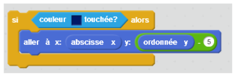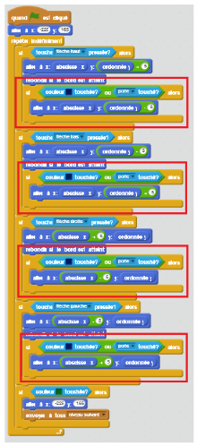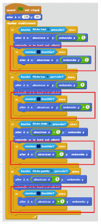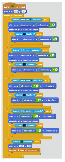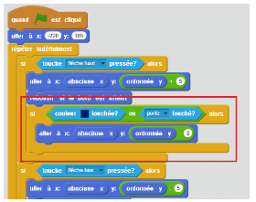 Explication du code : si le lutin touche la couleur choisie pour dessiner le labyrinthe (ici le bleu), alors il reste sur son axe horizontal (X) et recule de 5 sur l’axe vertical (Y). Ceci va donc faire l’effet inverse du déplacement qu’on vient de réaliser suite à l’appui sur la flèche haut. On créé ainsi l’illusion que le lutin n’a pas bougé, comme s’il était bloqué par le mur.
