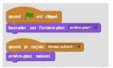 Explication du code : quand le drapeau vert est cliqué, l’arrière-plan affiche le premier niveau. Quand la scène reçoit le message «niveau suivant», l’arrière-plan change pour afficher le niveau suivant (pris dans la liste des costumes, donc il faut que les niveaux soient dans l’ordre dans la liste).