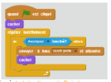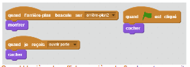 Explication du code : quand le jeu commence (le drapeau est cliqué), la clé se cache. Quand on passe au second niveau (l’arrière-plan change), la clé apparaît.