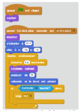 Explication du code : quand le drapeau vert est cliqué, la chauve-souris disparait. Quand l’arrière-plan change pour «arrière-plan2», elle apparait, change son orientation, pour parcourir toute la scène, et va se placer dessus. Ensuite, elle attend 0,2 secondes, change de costume (pour donner l’illusion qu’elle vole), et bouge dans tout l’espace en repartant de l’autre côté si elle atteint le bord. Si jamais elle touche l’Aventurier, le jeu s’arrête. Toutes ces actions se répètent indéfiniment.