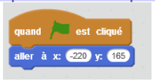 Il faut à présent s’assurer que le lutin apparaisse sur le point de départ et non un mur. Ajouter les blocs « quand drapeau est cliqué » et « aller à » au lutin, et inscrire les bonnes valeurs pour X et Y, afin que le lutin apparaisse dans le coin supérieur gauche. Pour savoir les valeurs à utiliser, placer le curseur de la souris sur le point de départ désiré. Les coordonnées s’inscrivent sous la zone de dessin. Dans notre exemple, il s’agit de -220 et 165 :