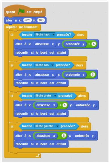 Explication du code : quand le drapeau vert est cliqué, le lutin se place en haut à gauche de la scène. L’ordinateur vérifie ensuite en permanence si une des touches « flèche … » est pressée. Si la flèche du haut est pressée, le lutin reste sur son axe horizontal (X) et avance de 5 sur l’axe vertical (Y). Si la flèche du bas est pressée, le lutin reste sur son axe horizontal (X) et recule de 5 sur l’axe vertical (Y). Si la flèche de droite est pressée, le lutin avance de 5 sur son axe horizontal (X) et reste sur son axe vertical (Y). Si la flèche de gauche est pressée, le lutin recule de 5 sur son axe horizontal (X) et reste sur son axe vertical (Y). Dans tous les cas, si le lutin rencontre le bord, il est repoussé.