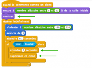 - Remplacer « Quand le drapeau vert est cliqué » par « Quand je commence comme un clone »