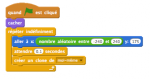 - Enfin, ajouter le script qui va générer les clones en les disposant aléatoirement en haut de l’écran.