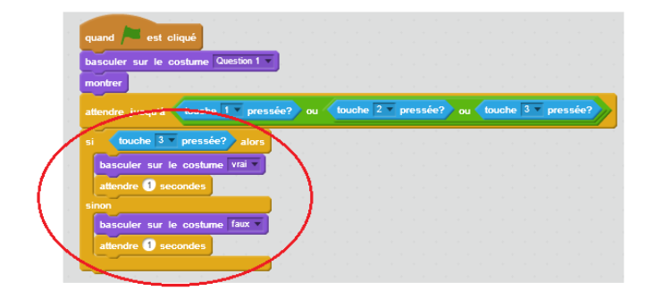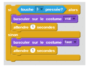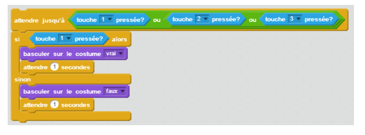 Explication du code : si le joueur a appuyé sur la touche 3 (la bonne réponse dans l’exemple), le lutin bascule sur le costume « vrai » et attend ce costume pendant 1 seconde. Si le joueur a cliqué sur une autre touche, le lutin bascule sur le costume « faux » et attend pendant 1 seconde.