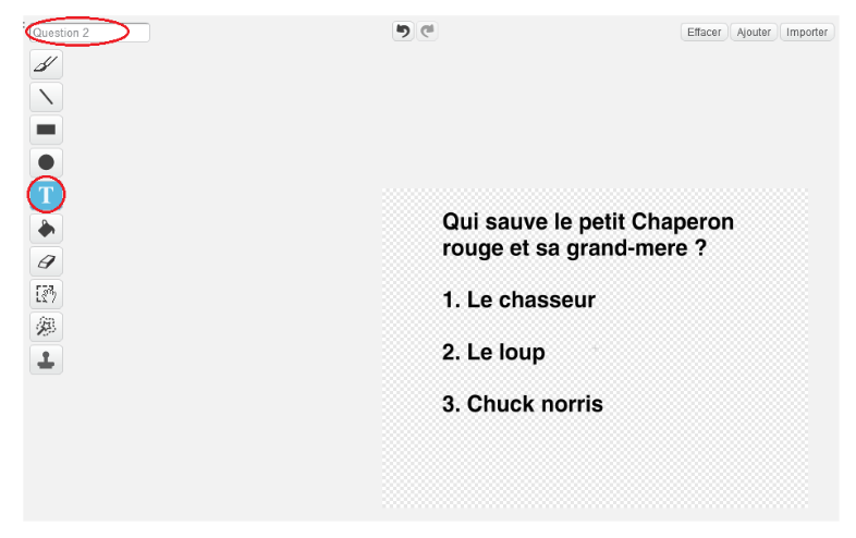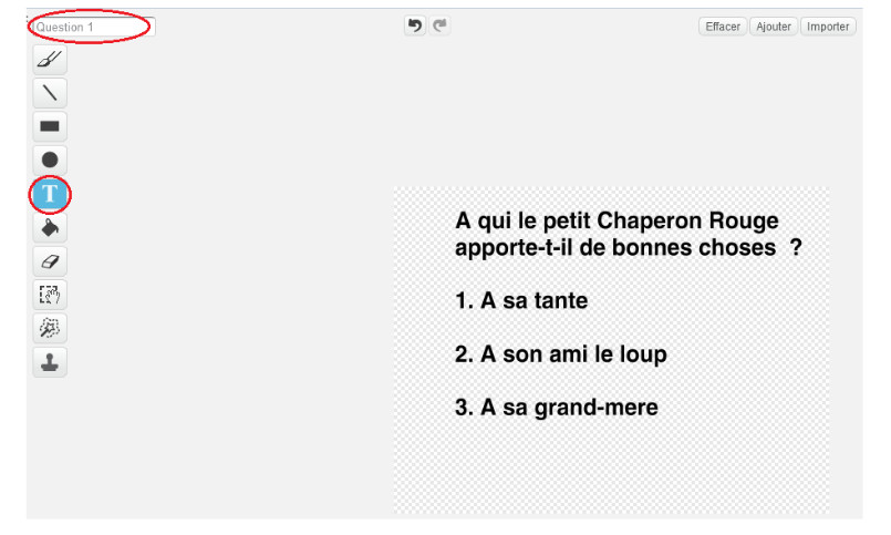 La question sera en fait le costume du lutin. Dans la zone de travail, cliquer sur T pour ajouter du texte, et écrire une question et trois réponses possibles (une seule doit être vraie). Renommer le costume « question 1 » (case en haut à gauche).