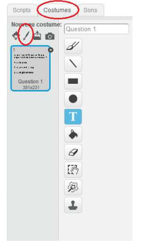 Ajouter autant de questions que souhaité en ajoutant d’autres costumes au même lutin. Pour ce faire, rester sur l’onglet « Costume »et cliquer sur l’icône de pinceau juste en dessous.