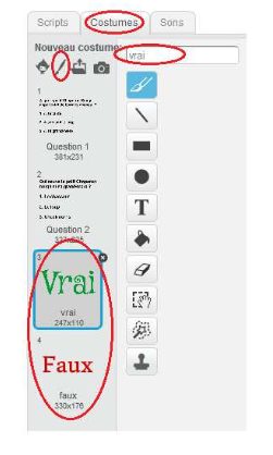 Enfin, créer deux costumes nommés « vrai » et « faux », en utilisant cette fois du texte coloré (le vrai et le faux en couleurs différentes). Dans l’exemple, les questions sont en noir, le vrai en vert et le faux en rouge.