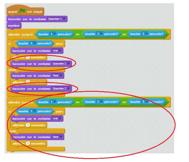 Le code pour la seconde question est identique à celui pour la première, sauf que cette fois c’est la réponse 1 qui est la bonne. Le blocs à utiliser sont donc :