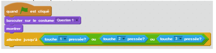 Explication du code : quand le drapeau vert est cliqué, le lutin bascule sur le costume « Question 1 » et apparait la question 1. Le script se suspend le temps que le joueur ait cliqué sur les touches 1, 2 ou 3 du clavier.