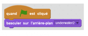 Il faut que ce décor soit visible. Pour cela, il faut le faire apparaître au démarrage de l’animation, grâce au bloc « basculer sur l’arrière-plan », qu’il faut accrocher au bloc « quand drapeau vert est cliqué », comme ceci :
