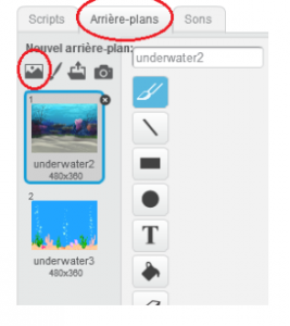Cliquer sur l’icône d’image en dessous de la scène. Choisir un décor qui convient ; pour l’exemple ce sera «underwater2», il est dans le dossier «nature».