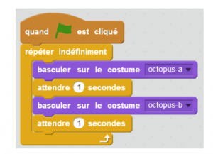 Cliquer sur le drapeau vert pour vérifier le résultat. Comme les costumes A et B montrent les tentacules dans des positions différentes, en changeant de costume, on obtient l’impression que le lutin bouge. Essayer différentes valeurs d’attente (2 secondes, 0,5, …) et cliquer sur le drapeau vert pour tester différentes vitesses d’animation.