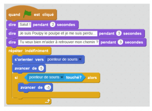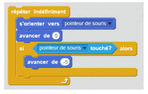 Explication du code : le lutin va d’abord se tourner vers le pointeur de la souris, puis avancer de 5 pas. S’il a touché le pointeur, il va avancer de « -5 » pas, c’est-à-dire reculer.