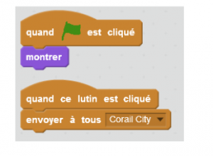 Explication du code : quand l’histoire commence (le drapeau vert est cliqué), le panneau apparait (« montrer »). Quand le panneau est cliqué, il envoie le message « corail city » (cliquer la petite flèche puis « nouveau message » et lui donner un nom) à tous les éléments de Scratch (décor, lutins,…).