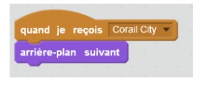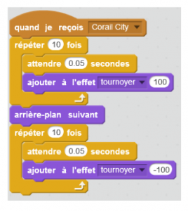 Explication du code : quand l’arrière-plan reçoit le message «Corail City», en dix étapes (« répéter 10 fois »), l’arrière-plan va attendre 0,5 secondes puis se déformer (effet tournoyer). Il va ensuite changer. Enfin, il va de nouveau tournoyer en dix étapes, mais dans l’autre sens (la valeur est -100, alors que la première fois elle était de 100).