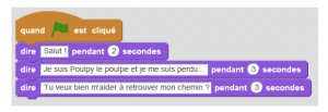 A présent, faisons parler le lutin. Deux blocs « dire … » peuvent servir à cela. Ajouter le bloc qui possède une durée (« dire … pendant … secondes ») plusieurs fois, et remplir le texte comme ci-dessous pour créer un dialogue ::