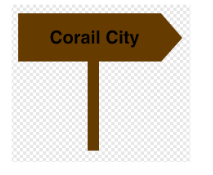 Dessiner un panneau et utiliser l’outil texte (icône T) pour inscrire le nom d’un lieu dessus, par exemple « Corail City » :