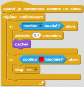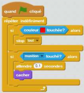 Il ne reste plus qu’à faire que l’alien disparaisse lorsqu’il est touché par une munition. Compléter le même script avec les blocs suivants :